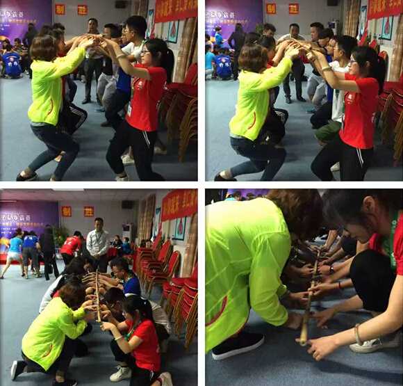 上图为同心杆游戏体验,   通过游戏体验,锻炼团队的协作、用心、专注、同心的能力,自认为5分钟就可以完成游戏的团队,20分钟之后却只有一个小组完成