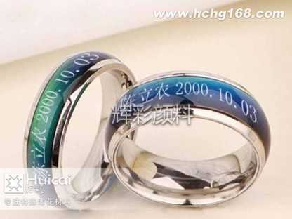 用温变粉打造感温变色戒指的时候,温变粉的用量为塑料量的0.4~3.0% ,通常为 0.6 ~2.0% ,感温变色粉与塑料粒子要充分混合均匀(混合时可使用少量白油),如果是普通颜料与变色颜料拼色,则普通颜料(或染料)的用量大约为变色颜料的0.5-2.5% 。且需要注意加工感温变色戒指的时候,温度应要控制在200℃以下,最高不要超过230℃,并尽量减少物料的受热时间。(高温,长时间加热将损害颜料的变色性能)。