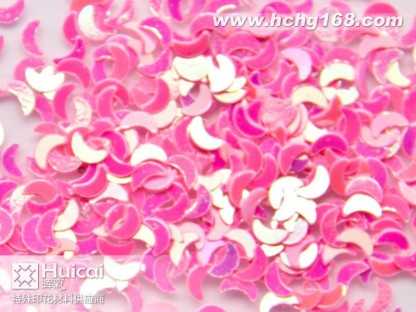金葱粉:又名闪光片。包括铝质金葱粉,聚酯金葱粉幻彩粉,镭射金葱粉等。有铝质,PETPVC材质。大小规格(size)由1/25601mm)至1/830mm)。形状有六角形,四角形,长条针形和不规则形状,并有多种颜色可供选择。各种材质金葱粉可不同程度承受高温(由80*C180*C300*C不等) 。
