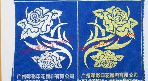 仿烫银浆、金浆的印花工艺流程:图片→晒网(80-100目)→调色→打底→印花→烘干→成品