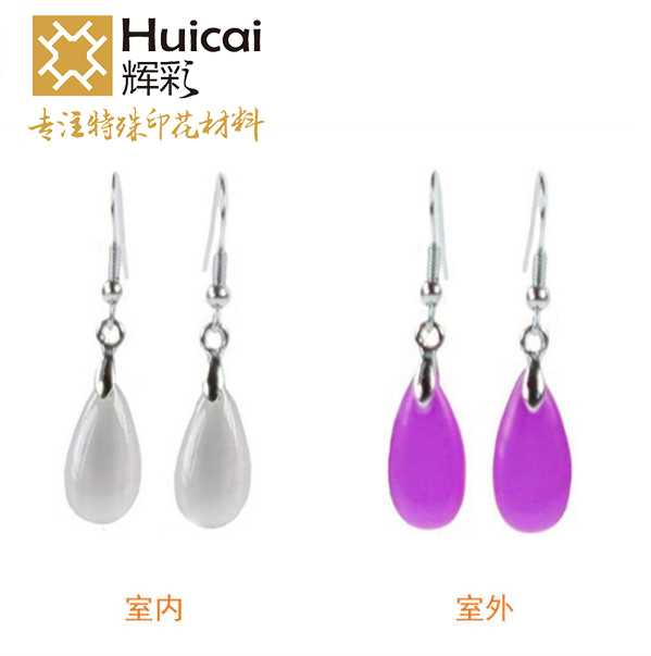 辉彩感光变色浆颜色:紫色、红色、蓝色、黄色、橙色,具有耐高温、抗氧化等微胶囊所改质的特性。感光变色浆不仅用于服装印花,还可应用于涂料、油墨、塑料各产业,产品之设计大多以室内(无紫外光之环境)与室 外(有紫外光之环境)有颜色变化为诉求。