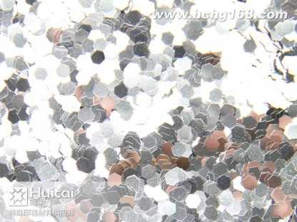 金葱粉:又名闪光片。包括铝质金葱粉,聚酯金葱粉,幻彩粉,镭射金葱粉等。有铝质,PET,PVC材质。大小规格(size)由1/256(0、1mm)至1/8(3、0mm)。形状有六角形,四角形,长条针形和不规则形状,并有多种颜色可供选择。各种材质金葱粉可不同程度承受高温(由80*C,180*C,300*C不等) 。