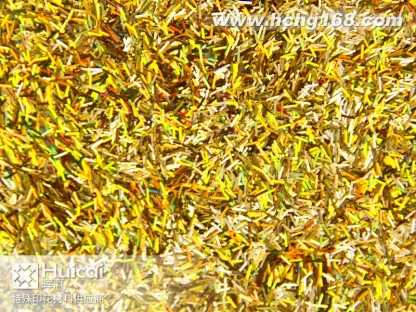 金葱粉:又名闪光片。包括铝质金葱粉,聚酯金葱粉,幻彩粉,镭射金葱粉等。有铝质,PET,PVC材质。大小规格(size)由1/256(0、1mm)至1/8(3、0mm)。形状有六角形,四角形,长条针形和不规则形状,并有多种颜色可供选择。各种材质金葱粉可不同程度承受高温(由80*C,180*C,300*C不等) 。