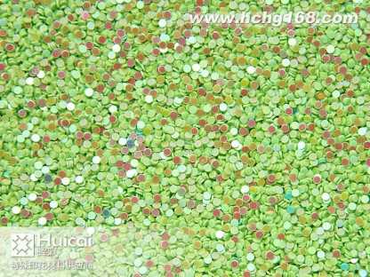 圆形金葱粉:又名圆形闪光片。包括幻彩片,镭射片、金片和银片等。主要材质有PETPVC两种材质。大小规格(size)由1.0mm10.0mm)。形状规则为圆形状,并有多种颜色可供选择。各种材质金葱粉可不同程度承受高温(由80*C180*C300*C不等) 。